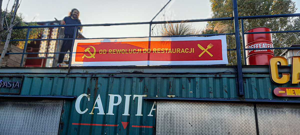 The slogan on the banner draws connections between the crossed hammer and sickle — a symbol of the workers' revolution that later became associated with communist totalitarianism, ultimately overthrown by the workers — and the crossed knife and fork, a common restaurant symbol representing consumption in a broader context.