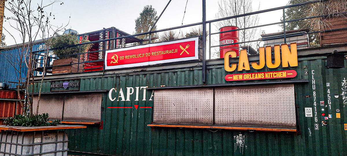 The banner was displayed on containers at 100cznia, located in the post-industrial area of the Gdańsk Shipyard. According to the project's website, 100cznia integrates container architecture, cultural offerings, and cuisines from diverse regions of the globe.