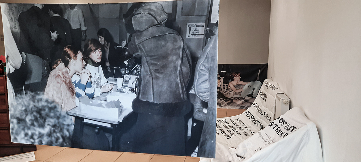 The installation, based on archival photographs, "reconstructs" the backstage of the 1981 Student Strike at the University of Łódź. The selected images focus on female students, highlighting their significant contributions to various organisational tasks, such as communications, poster printing, meal preparations, and cleaning.
