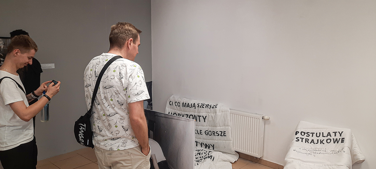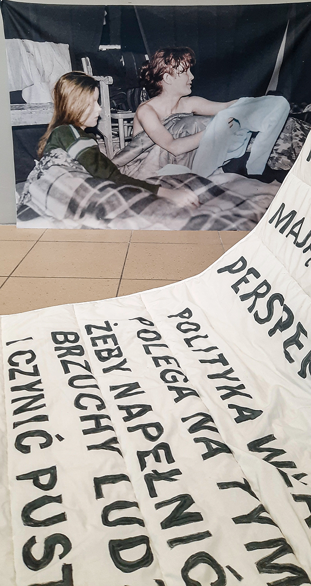 Enlarged black-and-white photographs featuring these female students, with their silhouettes colored and printed on fabric, were hung as part of the installation in the gallery space. These formal design choices aim to emphasise the presence and role of women in this strike and in numerous other political movements, whose contributions are often marginalised in dominant narratives. Accompanying the photographs are hand-painted quilts featuring slogans from the student strike at the University of Łódź, referencing the weeks-long occupation of the university.
