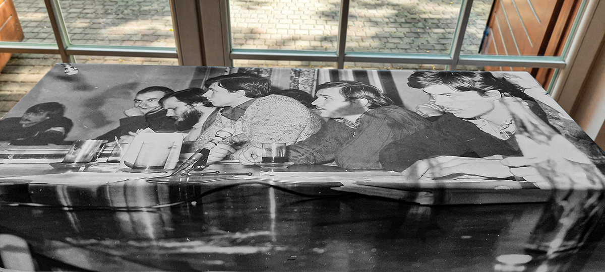 The situational photos depict women students in the press office, resting in sleeping bags, and debating at the kitchen table. Notably, their absence from photographs depicting negotiations among students, university authorities, and the government is striking. No female students are sitting at the negotiation table.