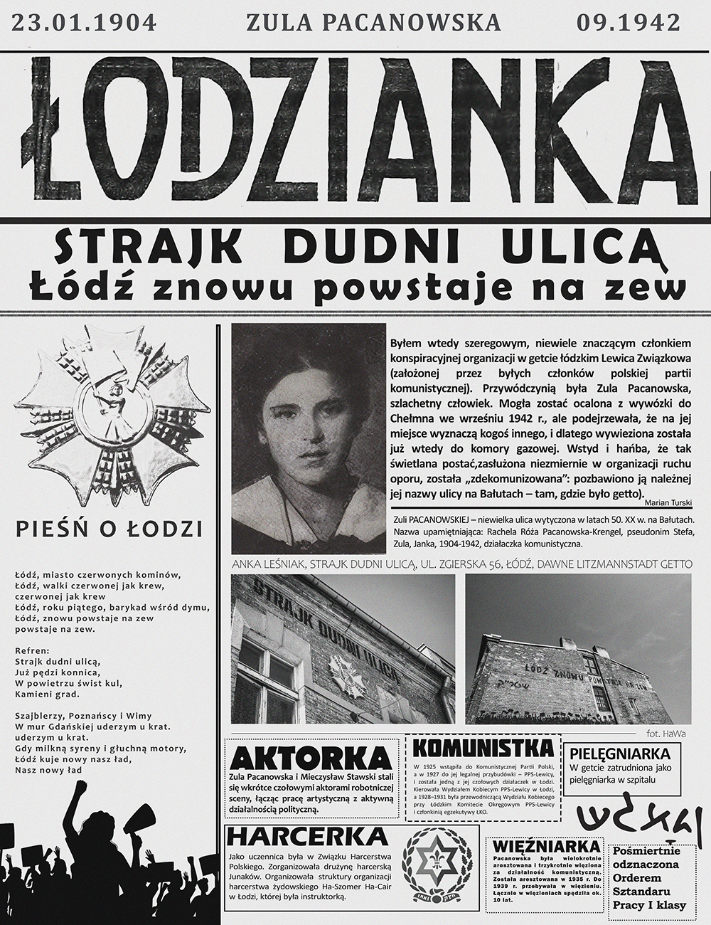This work honours the legacy of Zula Pacanowska as a committed communist, artist, nurse, member of the resistance in the Łódź Ghetto, and victim of the Nazis. Today, she is also a casualty of the thoughtlessly applied Decommunization Act, which led to the renaming of the street in Łódź that was dedicated to her memory.
