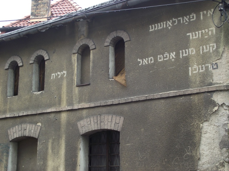 Napis „W opuszczonych domach często można spotkać Lilit (jid. in farlozene hejzer ken men trefen lilis)" wykonany został techniką szablonu. Nie został jednak namalowany, lecz „odczyszczony", wytarty w brudnym tynku. Praca jest więc symboliczną rewitalizacją budynku, którego dalsze losy są niepewne. Wykorzystałam tu związany z tradycją żydowską przesąd, że w opuszczonych domach można natknąć się na Lilit. W oknach zawieszona została połyskująca tkanina, której kolor zmienia się w zależności od pory dnia oraz pogody.