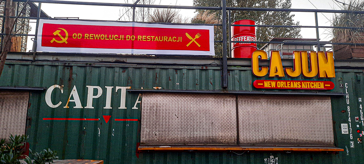Hasło na transparencie bazuje na asocjacjach między skrzyżowanym sierpem i młotem – symbolem rewolucji robotniczej, a później symbolu komunistycznego totalitaryzmu, który to ustrój w konsekwencji obalili robotnicy i robotnice – oraz skrzyżowanym nożem i widelcem, często spotykanym symbolem restauracji, w szerszym kontekście kojarzonym z konsumpcją.