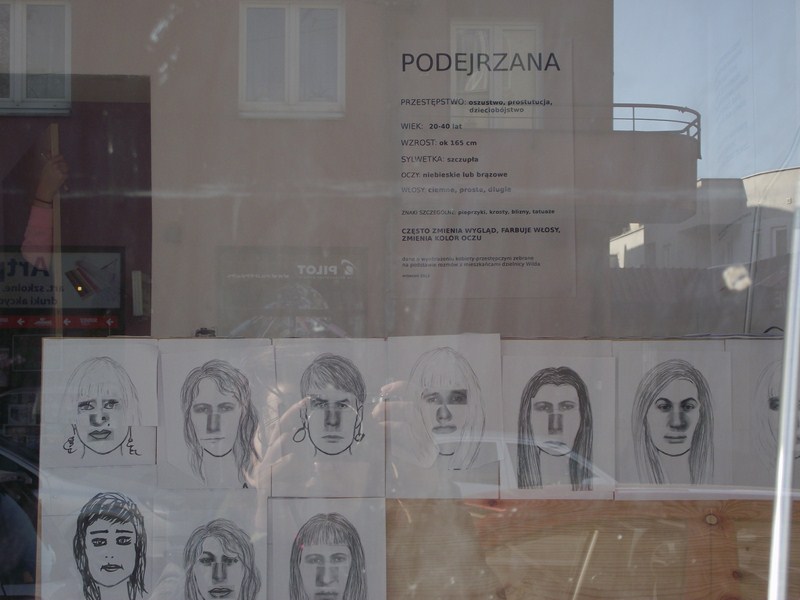 Therefore using a questionnaire I asked the inhabitants of Wilda, how does a female criminal look according to them (age, type, features of face, weight, height, education, origin, nationality) and which crimes she might commit. Based on the responses I made "identikit pictures" of female criminals, the products of society's imagination. I made 9 pictures which were hung on the door, staircases, yards and bill posts in Wilda. I was especially inspired by a man who said that such women often change their look - the colour of their hair, hairstyle, the colour of their eyes using contact lenses and make up. I was intrigued by this, because each of us has many "tools" to change her look in her cosmetic bag...